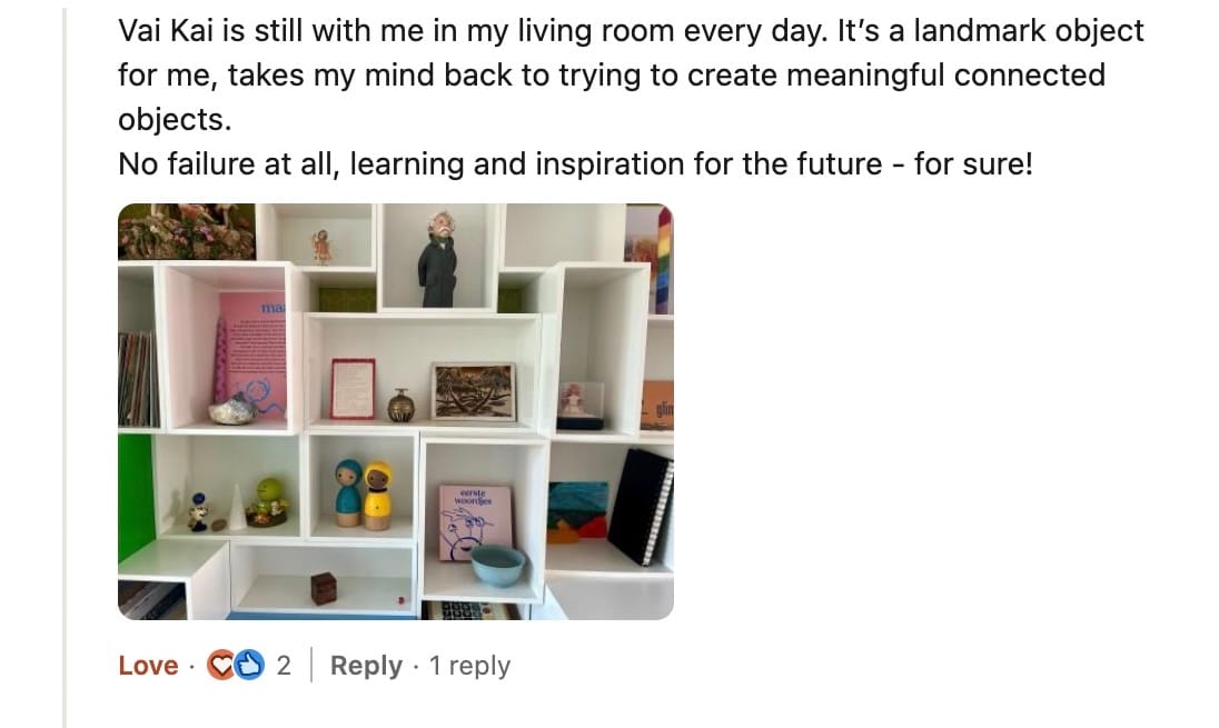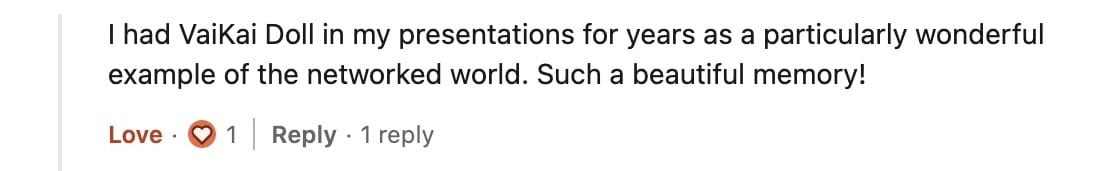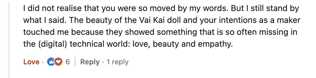 Yet, I never stopped dreaming. Recently, I shared a post on LinkedIn about the grief I once felt over VaiKai and reflecting on past failures, and I was overwhelmed by the number of positive comments from people who still remember the wooden dolls with digital hearts so fondly. Here are just a few of those messages: